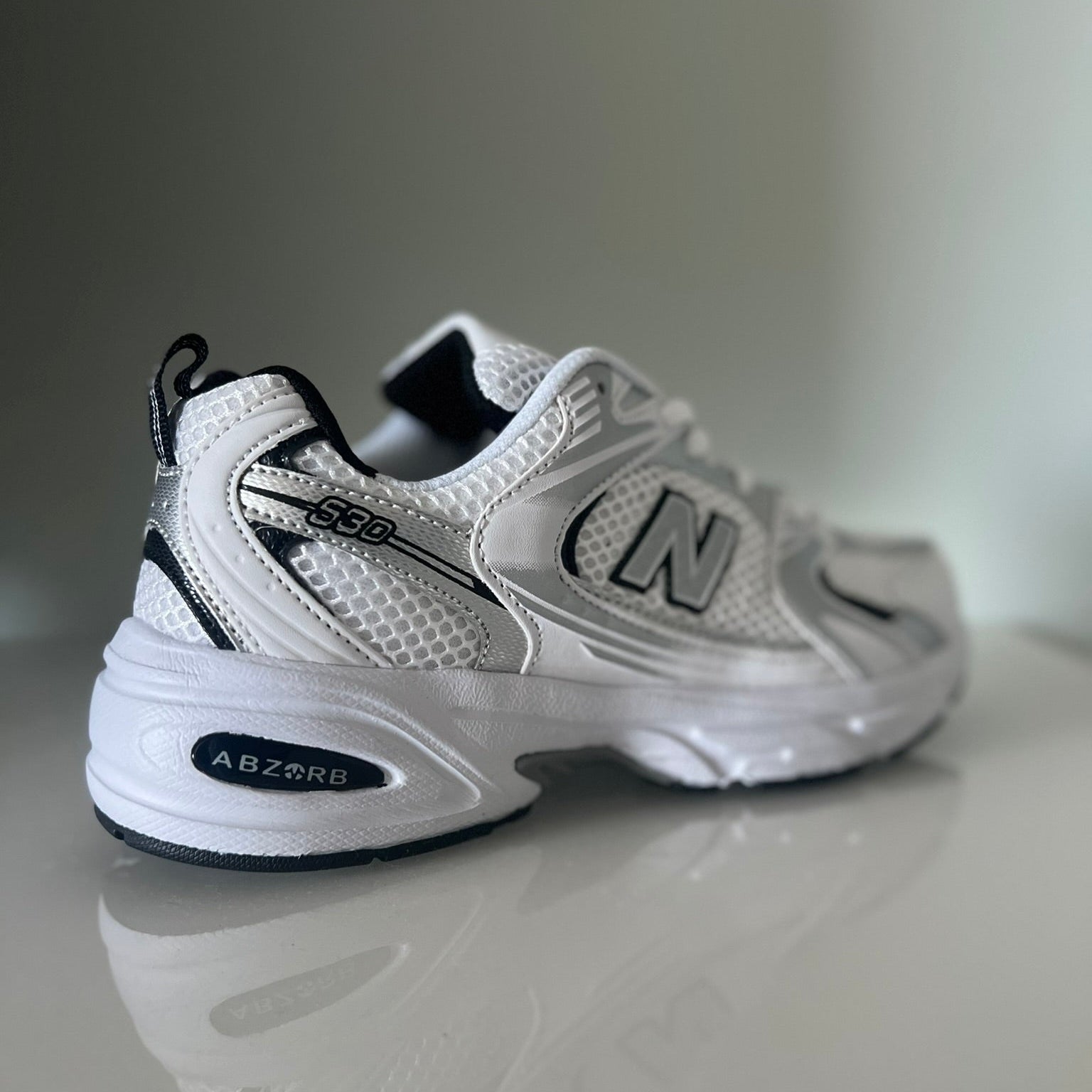 Zapatillas premium modelo 530 blanca con detalles gris y negros.